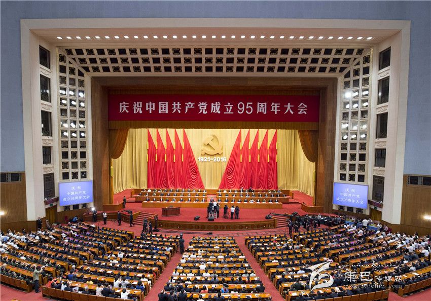 人民大會(huì)堂雄偉莊嚴(yán),萬人大禮堂燈火輝煌。主席臺(tái)上方懸掛著“慶祝中國共產(chǎn)黨成立95周年大會(huì)”會(huì)標(biāo)。帷幕正中,由鐮刀和錘頭組成的中國共產(chǎn)黨黨徽在十面紅旗映襯下熠熠生輝,“1921-2016”字樣格外醒目。大禮堂二層眺臺(tái)懸掛橫幅:緊密團(tuán)結(jié)在以習(xí)近平同志為總書記的黨中央周圍,銳意進(jìn)取、開拓創(chuàng)新,全面推進(jìn)黨的建設(shè)新的偉大工程,為實(shí)現(xiàn)“兩個(gè)一百年”奮斗目標(biāo)、實(shí)現(xiàn)中華民族偉大復(fù)興的中國夢而努力奮斗!