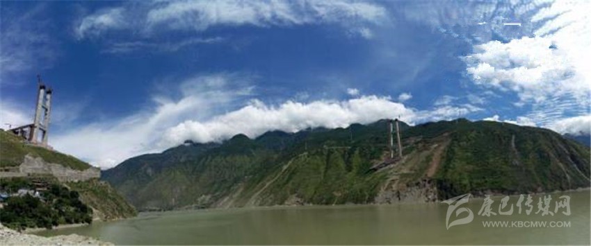 沿國道318線繼續(xù)往康定方向走,奔涌的大渡河鑲嵌在連綿起伏的山巒之間。車行一段距離后,矗立在河兩岸的兩座高聳的橋塔映入眼簾。這就是建設中的“川藏第一橋”——瀘定大渡河興康特大橋。