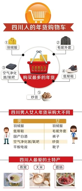 還有幾天就過年了,你們家買了哪些年貨?近日,電商平臺阿里巴巴和京東先后推出了年貨大數(shù)據(jù)。從這些數(shù)據(jù)中,我們能看到一個典型成都人的年貨網(wǎng)絡(luò)購物車是這樣的:購買最多的年貨還是衣服,其中羽絨服、毛呢外套是成都人的最愛;家電和電子產(chǎn)品愛買空氣凈化設(shè)備和玫瑰金iPhone7手機(jī);食品是山核桃等炒貨,以及國產(chǎn)白酒。在女性偏好酒水消費(fèi)的排名中,四川女性排名第五。