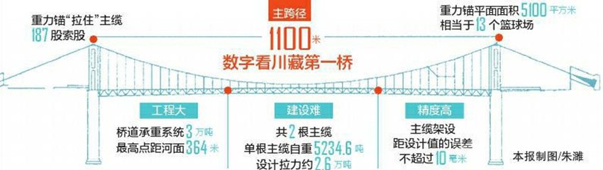從地面走上188米高的塔臺,經(jīng)過1100米的主橋,再從塔臺間往下來到隧道錨,全程1個多小時。橋中最低處,距離河面也有269米。站在貓道往下俯視,大渡河如一塊碧玉,國道318線上的汽車小如煙盒。