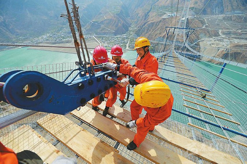 經(jīng)過2小時的牽引施工,4月5日,雅康高速公路重點控制性工程、被稱為“川藏第一橋”的瀘定大渡河興康特大橋首根主纜索股成功架設,跨越大渡河“鎖定”在康定、雅安境內的錨碇上。特大橋上部構架主體工程施工由此正式啟動,甘孜藏區(qū)迎來首條高速大通道指日可待。