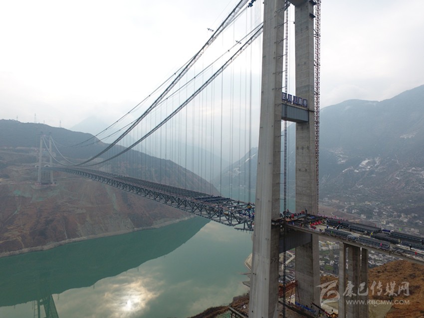 “大橋鋼桁梁完成合龍,標志著大橋全面進入橋面施工階段,也標志著這座建設(shè)在高海拔、高地震烈度帶、復(fù)雜風(fēng)場環(huán)境下的超大跨徑鋼桁梁懸索橋,施工中最難、風(fēng)險最大的施工全面完工?!毖趴蹈咚夙椖坎扛苯?jīng)理柏國勝激動地說。
