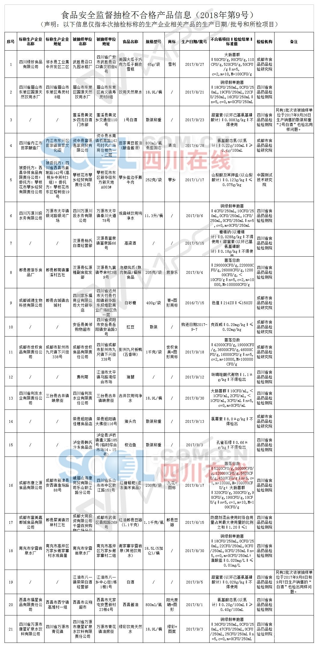 省食品藥品監(jiān)管局相關負責人表示,對上述監(jiān)督抽檢中發(fā)現(xiàn)的不合格產品,生產經營者所在地食品藥品監(jiān)管部門已按相關規(guī)定開展核查處置,責令違法生產經營者下架、召回不合格產品,徹查問題原因并全面整改,并責令成都、自貢、攀枝花、綿陽、遂寧、內江、樂山、南充、廣安、達州、雅安、眉山、資陽、甘孜、涼山市(州)食品藥品監(jiān)管部門應在2018年5月22日前向省食品藥品監(jiān)督管理局報告核查處置情況并向社會公布。