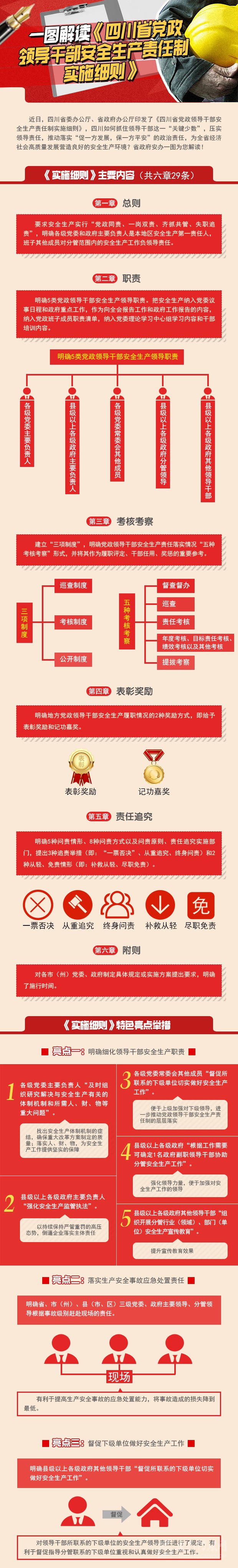主要明確了出臺(tái)實(shí)施細(xì)則的目的、依據(jù)、適用范圍、指導(dǎo)思想和實(shí)現(xiàn)途徑等。要求安全生產(chǎn)實(shí)行“黨政同責(zé)、一崗雙責(zé)、齊抓共管、失職追責(zé)”,明確各級(jí)黨委和政府主要負(fù)責(zé)人是本地區(qū)安全生產(chǎn)第一責(zé)任人,班子其他成員對(duì)分管范圍內(nèi)的安全生產(chǎn)工作負(fù)領(lǐng)導(dǎo)責(zé)任。