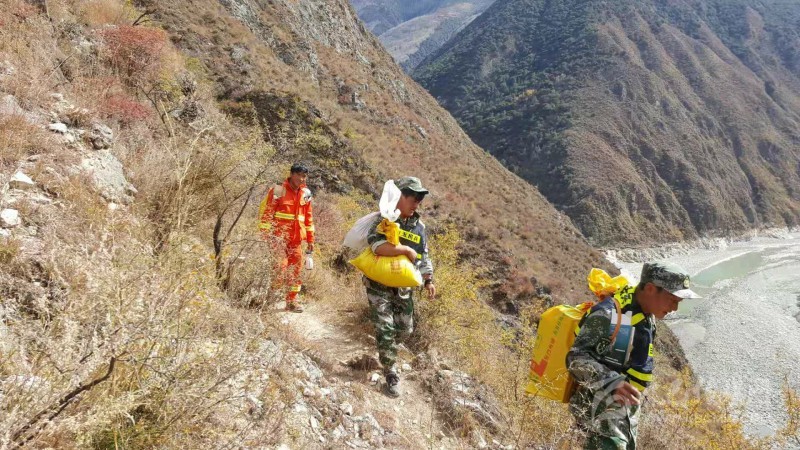 車輛無法前行,白玉縣民兵以及相關(guān)應急隊伍將救災物資順著小路背上現(xiàn)場