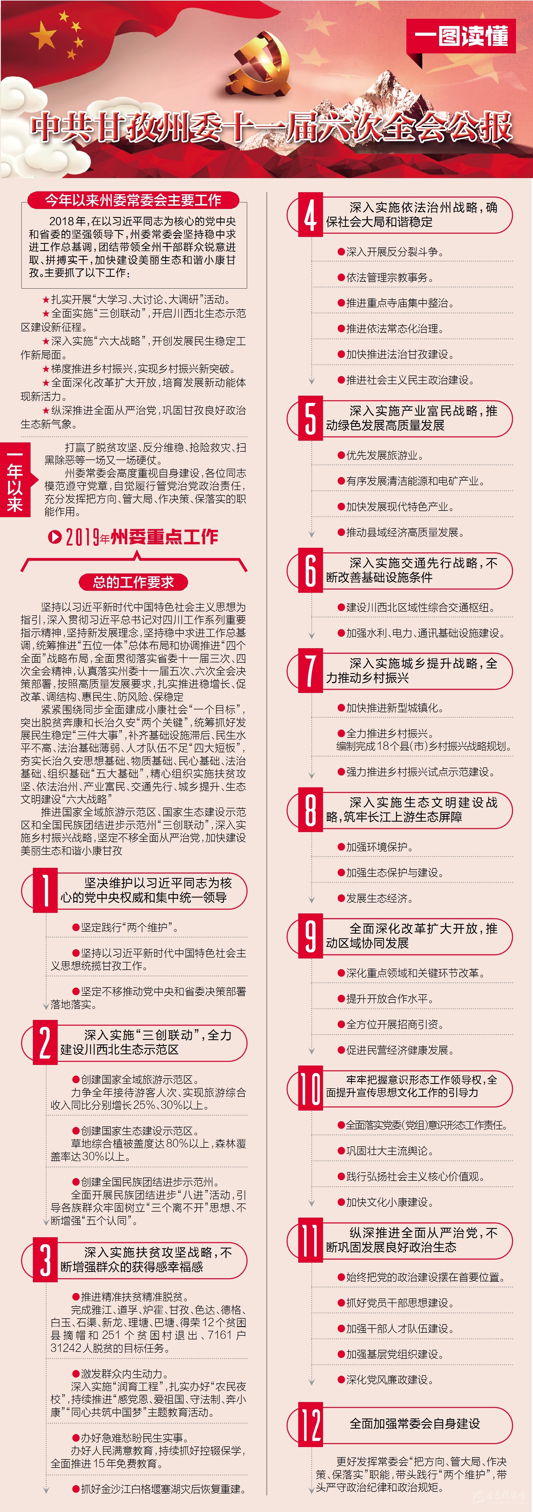本網(wǎng)訊 昨(19)日,州委十一屆六次全體(擴(kuò)大)會(huì)議在康定隆重召開,州委書記劉成鳴在全體(擴(kuò)大)會(huì)議第二次會(huì)議上作重要講話。他強(qiáng)調(diào),全州上下要緊密團(tuán)結(jié)在以習(xí)近平同志為核心的黨中央周圍,堅(jiān)定以習(xí)近平新時(shí)代中國(guó)特色社會(huì)主義思想為指導(dǎo),以更大的力度解放思想、開拓創(chuàng)新,以更大的決心補(bǔ)齊短板、強(qiáng)化措施,以更大的氣魄干事創(chuàng)業(yè)、推動(dòng)工作,以全域脫貧全民致富的優(yōu)異成績(jī)兌現(xiàn)向全州人民的莊嚴(yán)承諾,以建設(shè)美麗生態(tài)和諧小康甘孜的巨大成就向新中國(guó)成立70周年獻(xiàn)禮。