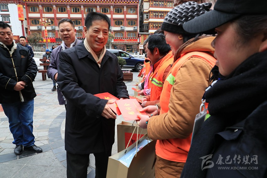 “你們每月工資多少?都按時(shí)領(lǐng)到了嗎?還有什么困難嗎?……”,慰問中劉成鳴非常關(guān)心環(huán)衛(wèi)工人的生產(chǎn)生活情況,與大家一一握手問好。劉成鳴代表州“四套班子”向奮戰(zhàn)在環(huán)衛(wèi)戰(zhàn)線的全體干部職工致以崇高敬意和新春?jiǎn)柡?,?duì)堅(jiān)守崗位的環(huán)衛(wèi)工人付出的辛勤勞動(dòng)表示衷心感謝。他說,環(huán)衛(wèi)工人是城市的“美容師”,情歌之城康定近年來城市面貌不斷提升、城市環(huán)境不斷改善,這是我們環(huán)衛(wèi)工人辛勤勞動(dòng)和無私奉獻(xiàn)的結(jié)果。他說,隨著雅康高速的貫通,越來越多的游客會(huì)走進(jìn)甘孜來到康定,希望大家在新的一年里,再接再厲,繼續(xù)發(fā)揚(yáng)無私奉獻(xiàn)精神,立足本職,愛崗敬業(yè),把康定打扮得更加靚麗,為城市形象提升和全域旅游發(fā)展做出更大貢獻(xiàn)。他要求,相關(guān)部門要進(jìn)一步關(guān)心關(guān)愛環(huán)衛(wèi)工人,解決好他們工作和生活中的實(shí)際困難。