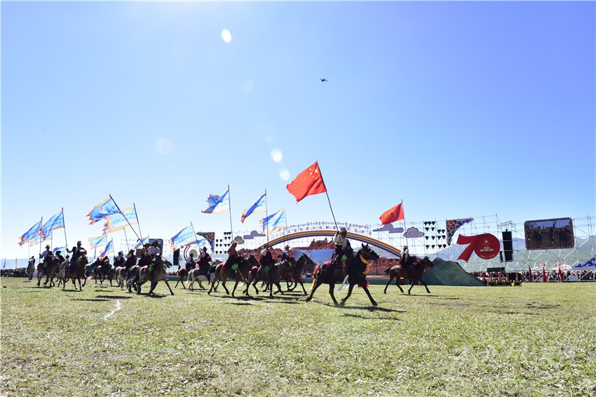 “四山旗似晴霞卷,萬馬蹄如驟雨來”。上午十點(diǎn),石渠縣四個片區(qū)組成的四個馬隊(duì)方陣高舉印有“世界最美濕地”“千年唐蕃古道”“石刻藝術(shù)王國”“吉祥太陽部落”字樣的四色彩旗,眾星拱月般簇?fù)碇腥A人民共和國國旗和慶祝中華人民共和國成立70周年活動標(biāo)識,策馬入場,拉開了2019中國·石渠—太陽部落帳篷狂歡節(jié)的帷幕。