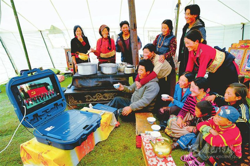 甘孜縣達(dá)通瑪片區(qū)卡龍鄉(xiāng)卡龍村牧民們高興地在新型帳篷中通過(guò)移動(dòng)電視收看康巴衛(wèi)視節(jié)目。 尹鋼攝