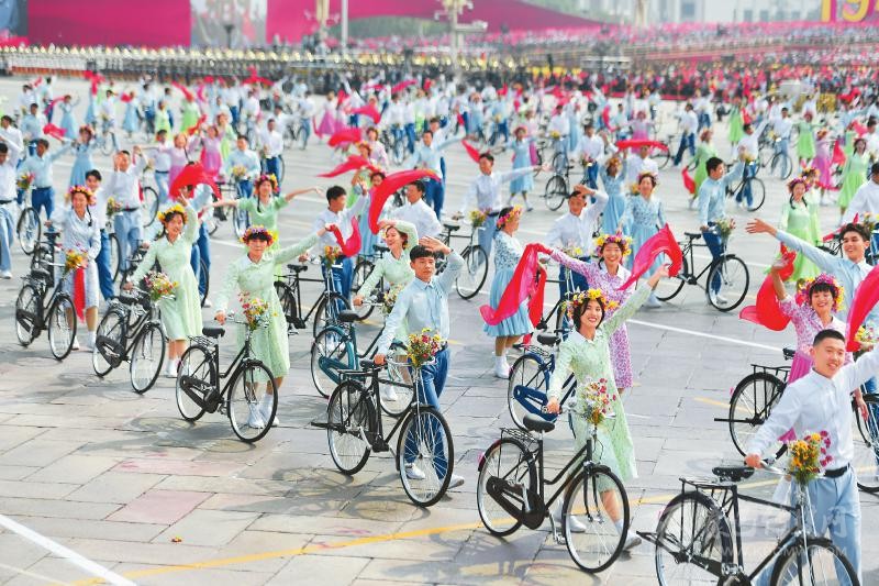 在10月1日上午進(jìn)行的國(guó)慶70周年群眾游行中,上百名少男少女騎著自行車從廣場(chǎng)通過(guò)。這個(gè)主題為“青春萬(wàn)歲”的場(chǎng)景喚醒了很多人對(duì)20世紀(jì)80年代的時(shí)代記憶……這是本次群眾游行中的第一個(gè)情境式行進(jìn)。