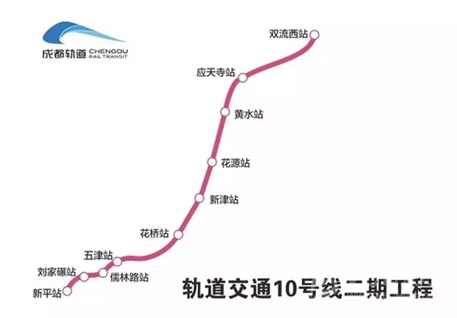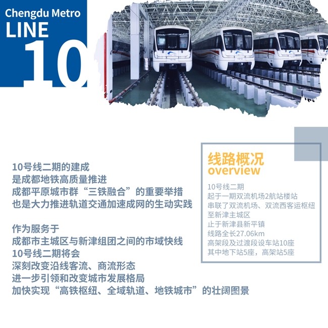 10號線二期起于一期雙流機(jī)場2航站樓站,串聯(lián)了雙流機(jī)場、雙流西客運樞紐至新津主城區(qū),止于新津縣新平鎮(zhèn),線路全長27.06km,高架段及過渡段設(shè)車站10座,其中地下站5座,高架站5座。
