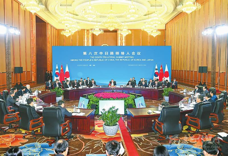 十二月二十四日,國務(wù)院總理李克強在成都與韓國總統(tǒng)文在寅、日本首相安倍晉三共同出席第八次中日韓領(lǐng)導(dǎo)人會議。新華社記者 張領(lǐng) 攝