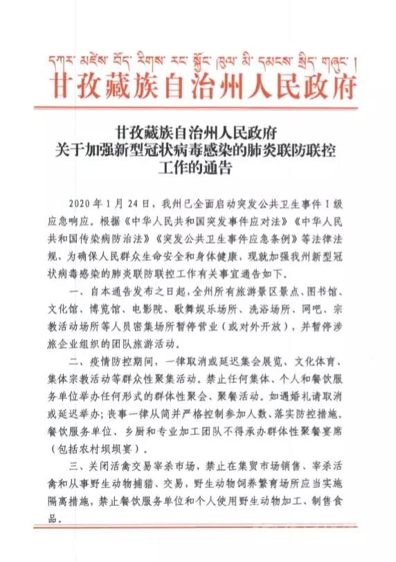 2020年1月24日,我州已全面啟動(dòng)突發(fā)公共衛(wèi)生事件I級(jí)應(yīng)急響應(yīng)。根據(jù)《中華人民共和國突發(fā)事件應(yīng)對(duì)法》《中華人民共和國傳染病防治法》《突發(fā)公共衛(wèi)生事件應(yīng)急條例》等法律法規(guī),為確保人民群眾生命安全和身體健康,現(xiàn)就加強(qiáng)我州新型冠狀病毒感染的肺炎聯(lián)防聯(lián)控工作有關(guān)事宜通告如下。一、自本通告發(fā)布之日起,全州所有旅游景區(qū)景點(diǎn)、圖書館、文化館、博覽館、電影院、歌舞娛樂場(chǎng)所、洗浴場(chǎng)所、網(wǎng)吧、宗教活動(dòng)場(chǎng)所等人員密集場(chǎng)所暫停營業(yè)(或?qū)ν忾_放),并暫停涉旅企業(yè)組織的團(tuán)隊(duì)旅游活動(dòng)。二、疫情防控期間,一律取消或延遲集會(huì)展覽、文化體育、集體宗教活動(dòng)等群眾性聚集活動(dòng)。禁止任何集體、個(gè)人和餐飲服務(wù)單位舉辦任何形式的群體性聚會(huì)、聚餐活動(dòng)。如遇婚禮請(qǐng)取消或延遲舉辦;喪事一律從簡并嚴(yán)格控制參加人數(shù)、落實(shí)防控措施。餐飲服務(wù)單位、鄉(xiāng)廚和專業(yè)加工團(tuán)隊(duì)不得承辦群體性聚餐宴席(包括農(nóng)村壩壩宴)。三、關(guān)閉活禽交易宰殺市場(chǎng),禁止在集貿(mào)市場(chǎng)銷售、宰殺活禽和從事野生動(dòng)物捕獵、交易,野生動(dòng)物飼養(yǎng)繁育場(chǎng)所應(yīng)當(dāng)實(shí)施隔離措施,禁止餐飲服務(wù)單位和個(gè)人使用野生動(dòng)物加工、制售食品。四、嚴(yán)格執(zhí)行政府依法制定的價(jià)格干預(yù)措施和緊急措施,對(duì)假冒偽劣、惡意搶購、囤積居奇、哄抬物價(jià)等不法行為依法從嚴(yán)查處。五、廣大社會(huì)公眾要提高警惕,支持并參與愛國衛(wèi)生運(yùn)動(dòng),做好個(gè)人防護(hù),搞好居家消毒,減少外出和走親訪友,主動(dòng)報(bào)告涉及疫情傳播隱患的一切線索。1月10日以后,有過湖北等疫區(qū)旅居史的,請(qǐng)即刻報(bào)告所在地村委會(huì)(社區(qū))登記備案,自返鄉(xiāng)(進(jìn)州)之日起居家隔離觀察14天,并進(jìn)行早晚體溫監(jiān)測(cè)記錄和核驗(yàn);一旦出現(xiàn)發(fā)熱、乏力、呼吸困難、呼吸道感染(干咳為主)等癥狀,請(qǐng)立即佩戴口罩就近到當(dāng)?shù)蒯t(yī)療機(jī)構(gòu)發(fā)熱門診就診。六、州域內(nèi)所有單位和個(gè)人,必須接受衛(wèi)生行政主管部門或有關(guān)機(jī)構(gòu)的傳染病調(diào)查檢測(cè)、采集樣本等預(yù)防措施;病人、疑似病人和傳染病病人密切接觸者應(yīng)當(dāng)積極配合接受隔離治療、醫(yī)學(xué)觀察等控制措施,并如實(shí)提供有關(guān)情況。對(duì)拒絕配合的,公安機(jī)關(guān)將依法協(xié)助強(qiáng)制執(zhí)行;對(duì)妨害執(zhí)行公務(wù)的,公安機(jī)關(guān)將依法從嚴(yán)從重處理。七、嚴(yán)禁任何單位和個(gè)人發(fā)布不實(shí)信息,對(duì)有造謠、傳謠等違法行為的,公安機(jī)關(guān)將依法嚴(yán)厲查處。本通告自發(fā)布之日起施行,終止日期另行通告。