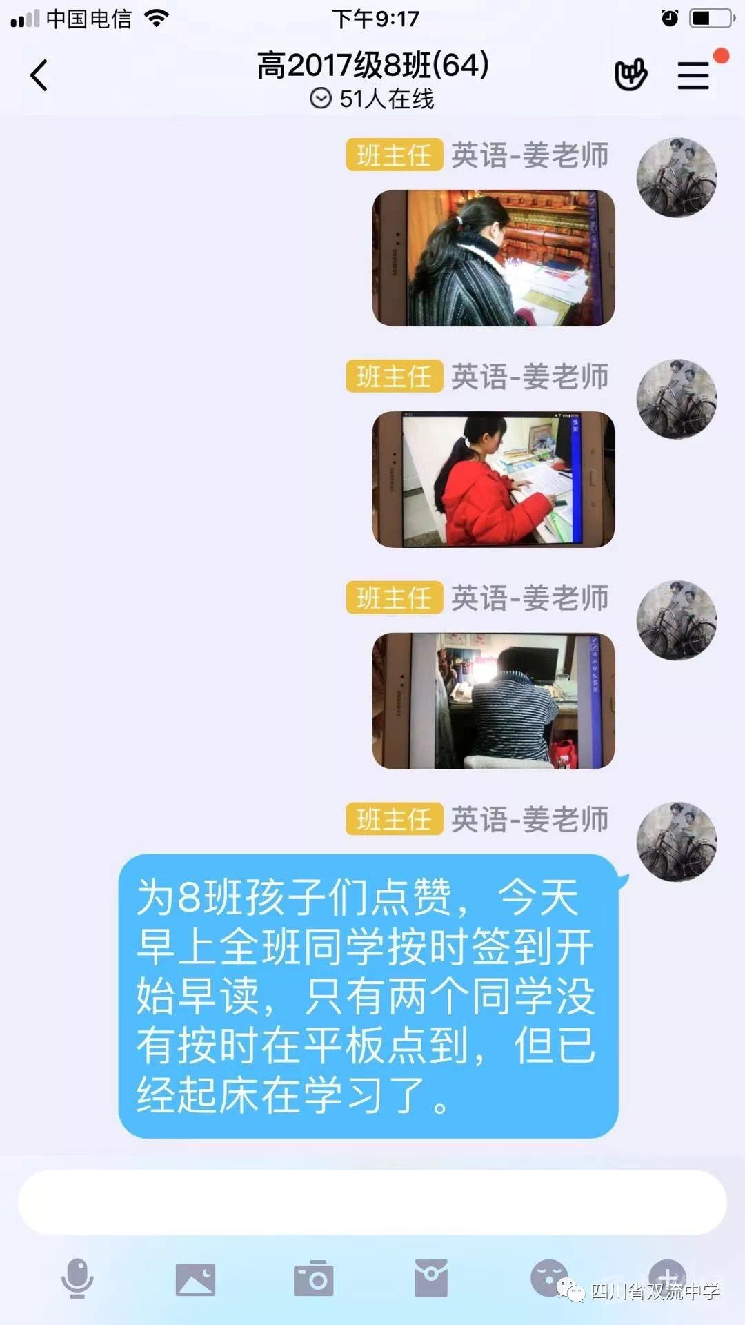 2月6日早上7時,雙流中學(xué)高三年級學(xué)生自主復(fù)習(xí)線上教學(xué)、管理正在進(jìn)行。班主任們通過家長微信群、學(xué)生平板班級群開始點(diǎn)到,保障學(xué)習(xí)效果,從恢復(fù)在校作息開始!