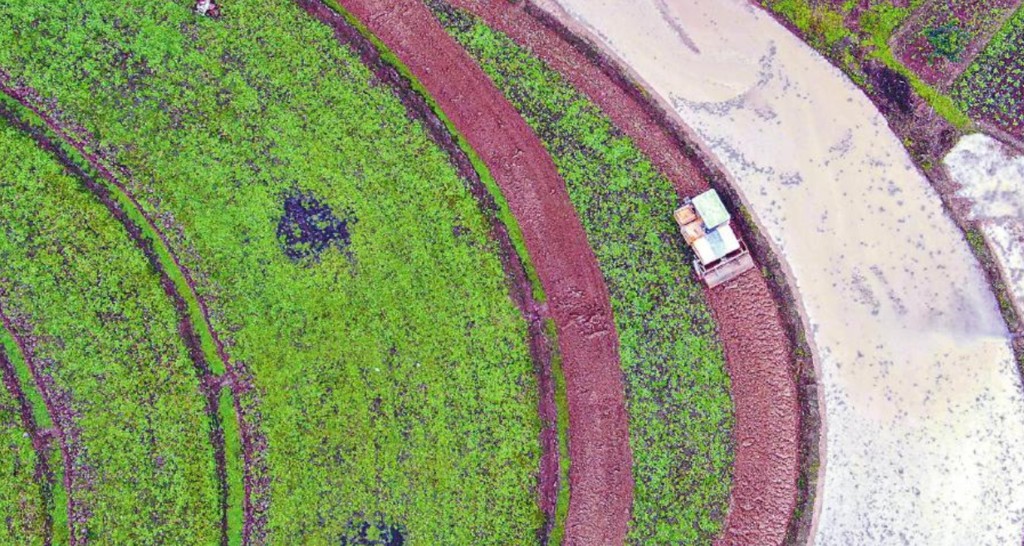 尋聲而去,記者看到一臺旋耕機正在一塊水田間緩慢行駛,刀片把枯黃的稻根、嫩綠的野草一并打碎,泥花飛濺,激起土里特有的潮味兒。