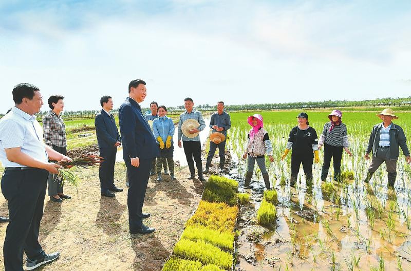 6月9日下午,習(xí)近平在銀川市賀蘭縣稻漁空間鄉(xiāng)村生態(tài)觀光園,同正在勞作的村民親切交談。 新華社 發(fā)