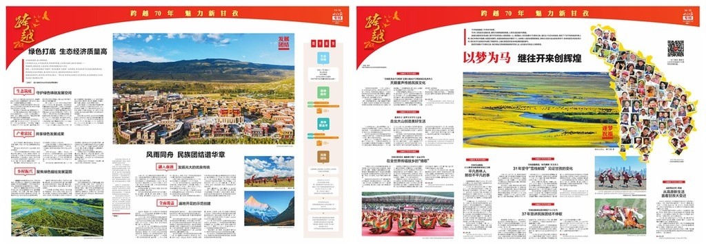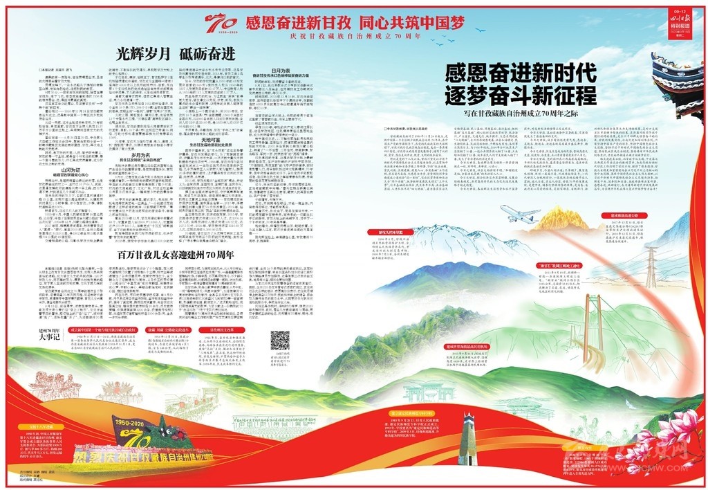 開篇連版以手繪甘孜建州70周年10件大事記鋪底,部分金山、碉樓等民族元素做點(diǎn)綴。版面上有州委州政府的署名文章,還有川報首席記者所寫《光輝歲月 砥礪奮進(jìn)》70年綜述,并鏈接二維碼,可通過手機(jī)掃碼看甘孜70年變遷。