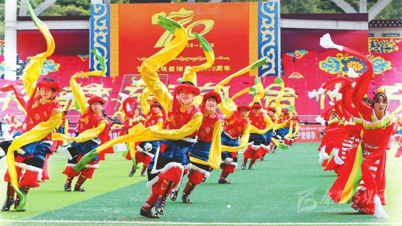 9月17日,甘孜藏族自治州成立70周年慶祝大會在康定舉行。各族群眾表演以“圣潔甘孜筑夢新時代”為主題的文藝節(jié)目。四川日報全媒體記者 歐陽杰 攝