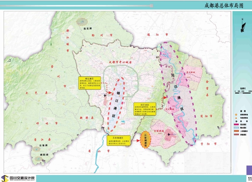 成都港將以旅游客運(yùn)為主,適度發(fā)展貨物運(yùn)輸,劃分為錦江港區(qū)、沱江港區(qū)、三岔湖港區(qū),形成“兩江一湖”港區(qū)為主,其它港點(diǎn)為補(bǔ)充的總體格局。