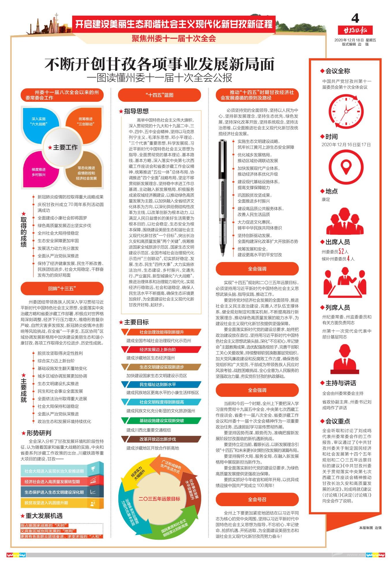 全會強調(diào),當(dāng)前和今后一個時期,全州上下要把深入學(xué)習(xí)宣傳貫徹黨的十九屆五中全會、中央第七次西藏工作座談會、省委十一屆八次全會、省委涉藏工作會議和州委十一屆十次全會精神作為一項重要政治任務(wù),迅速掀起學(xué)習(xí)宣傳貫徹?zé)岢?。要堅持因勢而謀、順勢而為,準(zhǔn)確把握新發(fā)展階段甘孜面臨的新機遇新挑戰(zhàn)。要堅持立足當(dāng)前、著眼長遠(yuǎn),以新發(fā)展理念引領(lǐng)“十四五”和未來更長時期甘孜發(fā)展的謀篇布局。要堅持胸懷大局、服務(wù)全局,在融入新發(fā)展格局中展現(xiàn)新?lián)?dāng)新作為。要全面落實新時代黨的建設(shè)總要求,為綠色高質(zhì)量發(fā)展提供堅強政治保障。要抓實抓好今年收官和明年開局,以優(yōu)異成績迎接中國共產(chǎn)黨成立100周年!