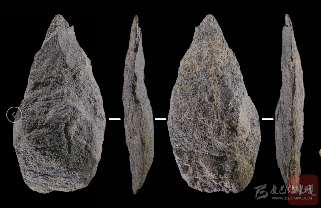 這塊有一端很尖的石頭,據(jù)說叫小型兩面器,看上去和手斧有點像,但比手斧小很多,目前在國內(nèi)舊石器時代尚屬首次發(fā)現(xiàn)。原來,它就是從石塊上打下的石片經(jīng)過加工后而成。它的邊緣頗為鋒利,端部尖銳,同樣具有切割、鉆孔等多種功能。