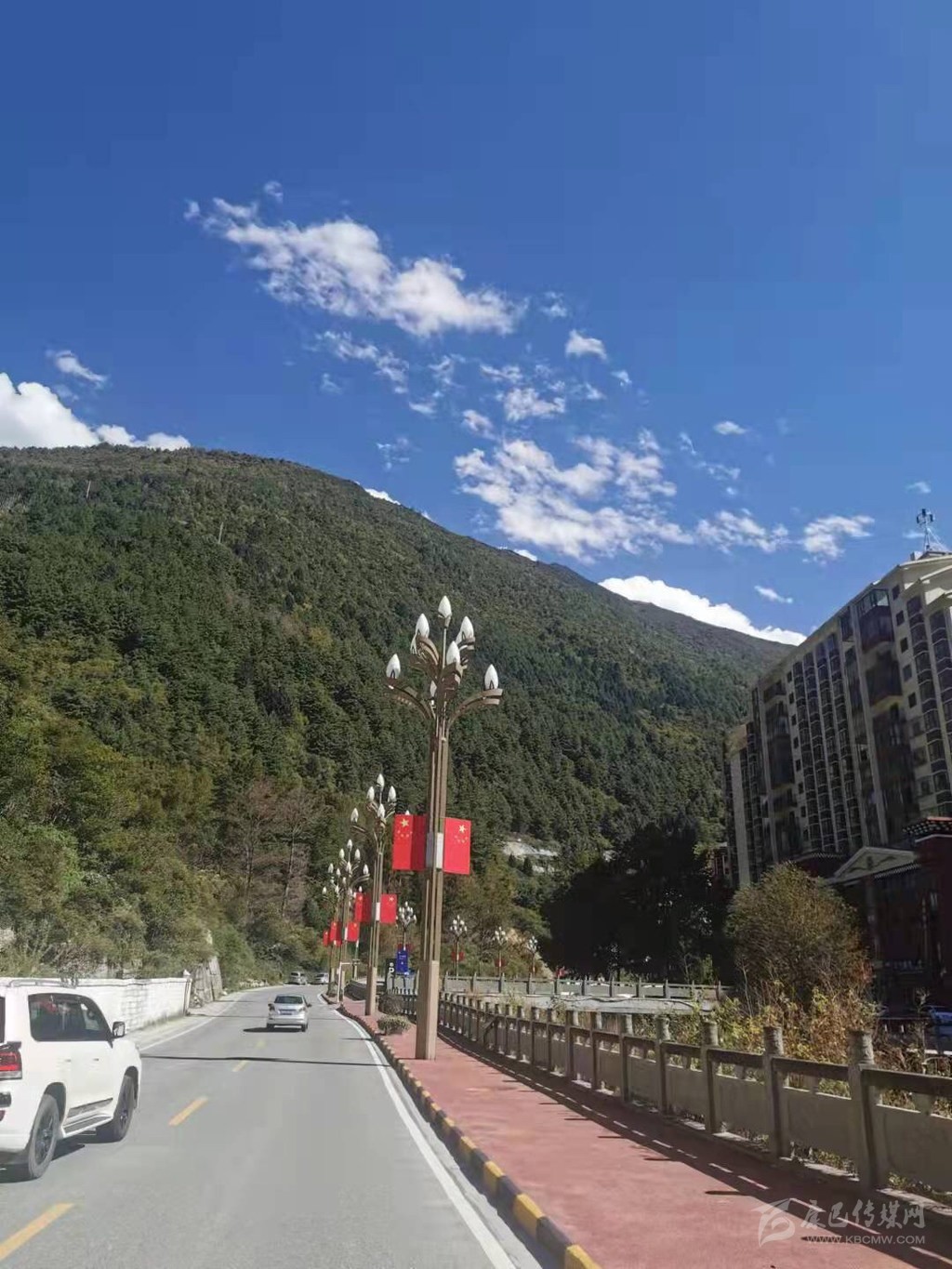 在南充古城閬中,以中天樓為核心鋪開的四條街道,全部被五星紅旗裝點開來,甚至部分街段上空鋪上了“紅旗?!?。新城的主干道,也掛上了一面面五星紅旗,站在街頭放眼望去,鮮艷的五星紅旗成為一道最靚麗的風景線。