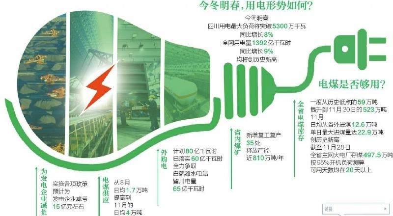 截至11月28日,全省主網(wǎng)火電廠存煤497.5萬噸,按95%開機負荷測算,可用天數(shù)均在20天以上。同時,國網(wǎng)四川省電力公司全力落實外購電量和留川電量,外購電計劃80億千瓦時已落實60億千瓦時,全力爭取白鶴灘水電站留川電量65億千瓦時。