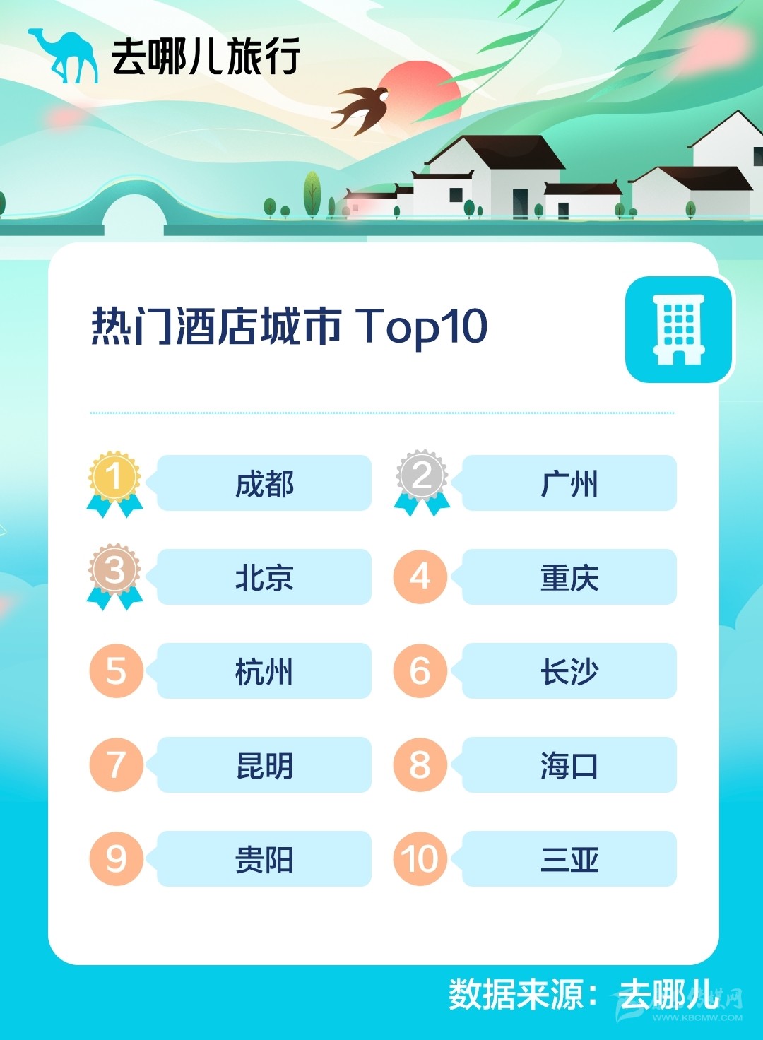 去哪兒旅行預(yù)測:2022清明假期熱門酒店城市TOP10。