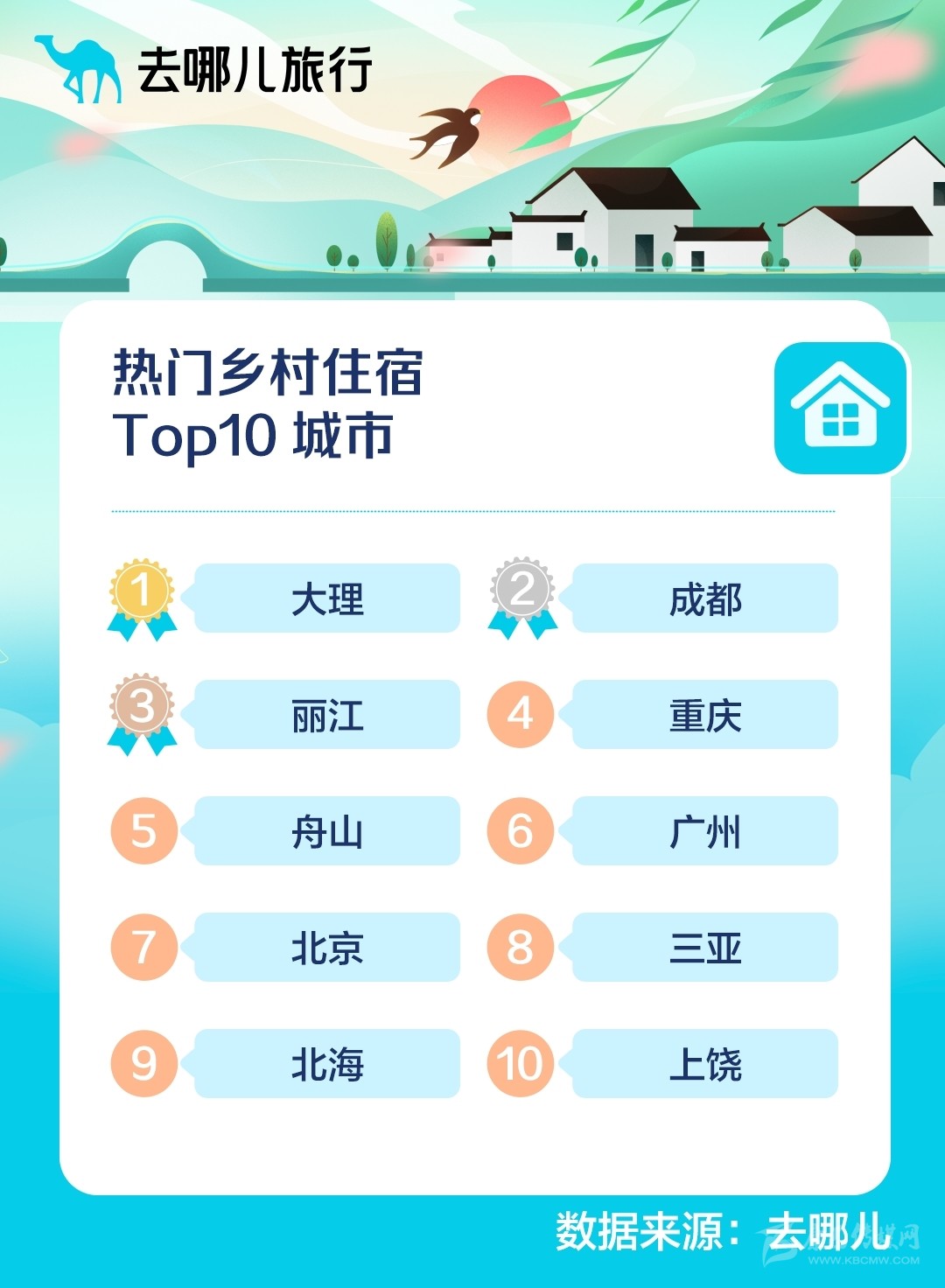 去哪兒旅行預(yù)測:2022清明假期熱門鄉(xiāng)村住宿TOP10城市。