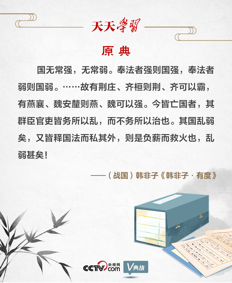 韓非子是戰(zhàn)國(guó)時(shí)期法家思想的集大成者?!坝卸取?,就是有法度。韓非子把“奉法”作為治亂興亡的關(guān)鍵,提出“國(guó)無常強(qiáng),無常弱。奉法者強(qiáng)則國(guó)強(qiáng),奉法者弱則國(guó)弱”。意思是,國(guó)家不會(huì)永遠(yuǎn)富強(qiáng),亦不會(huì)長(zhǎng)久貧弱。執(zhí)行法度的人堅(jiān)決,國(guó)家就會(huì)富強(qiáng);執(zhí)行法度的人軟弱,國(guó)家就會(huì)貧弱。