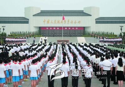 盧溝橋畔,坐落在這里的中國人民抗日戰(zhàn)爭紀(jì)念館雄偉莊嚴(yán)。紀(jì)念館前廣場上,鮮艷的五星紅旗高高飄揚(yáng)。紀(jì)念館正門上方懸掛著“勿忘國恥 圓夢中華”的巨幅標(biāo)語。