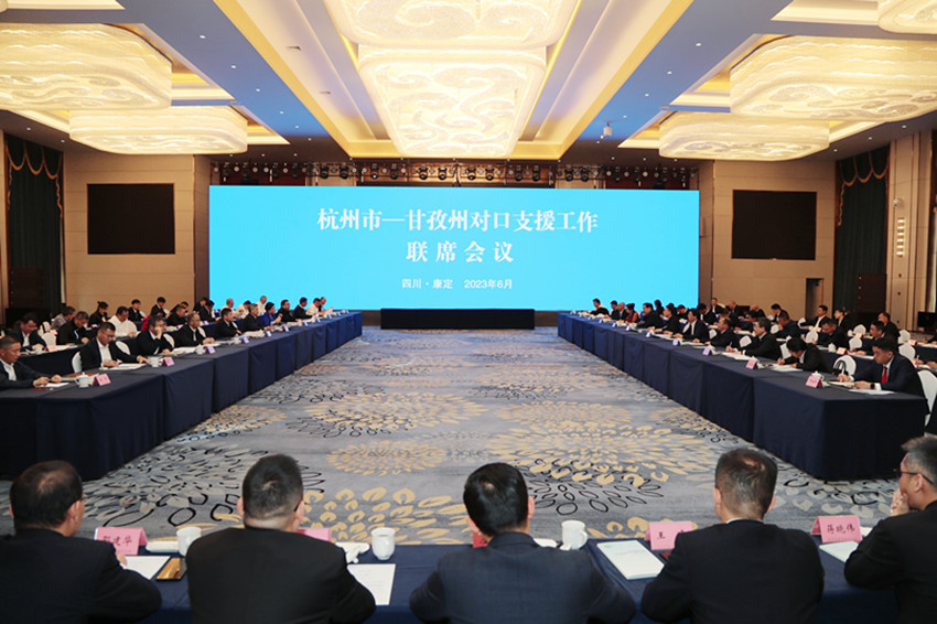 杭州市——甘孜州對口支援工作聯(lián)席會(huì)議現(xiàn)場。