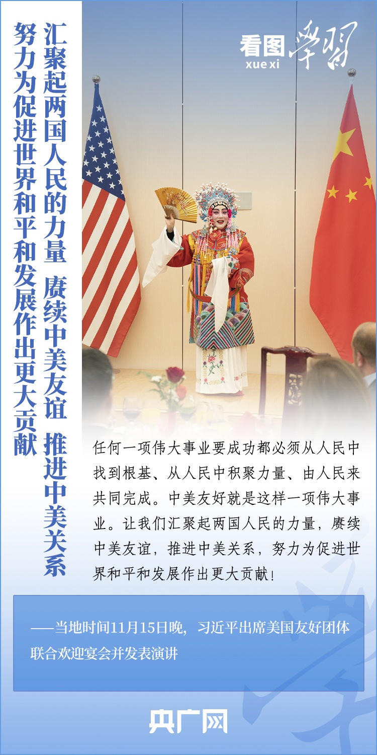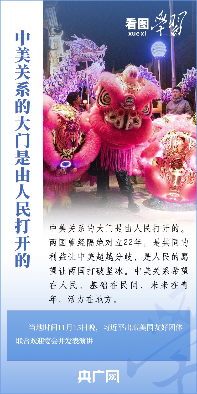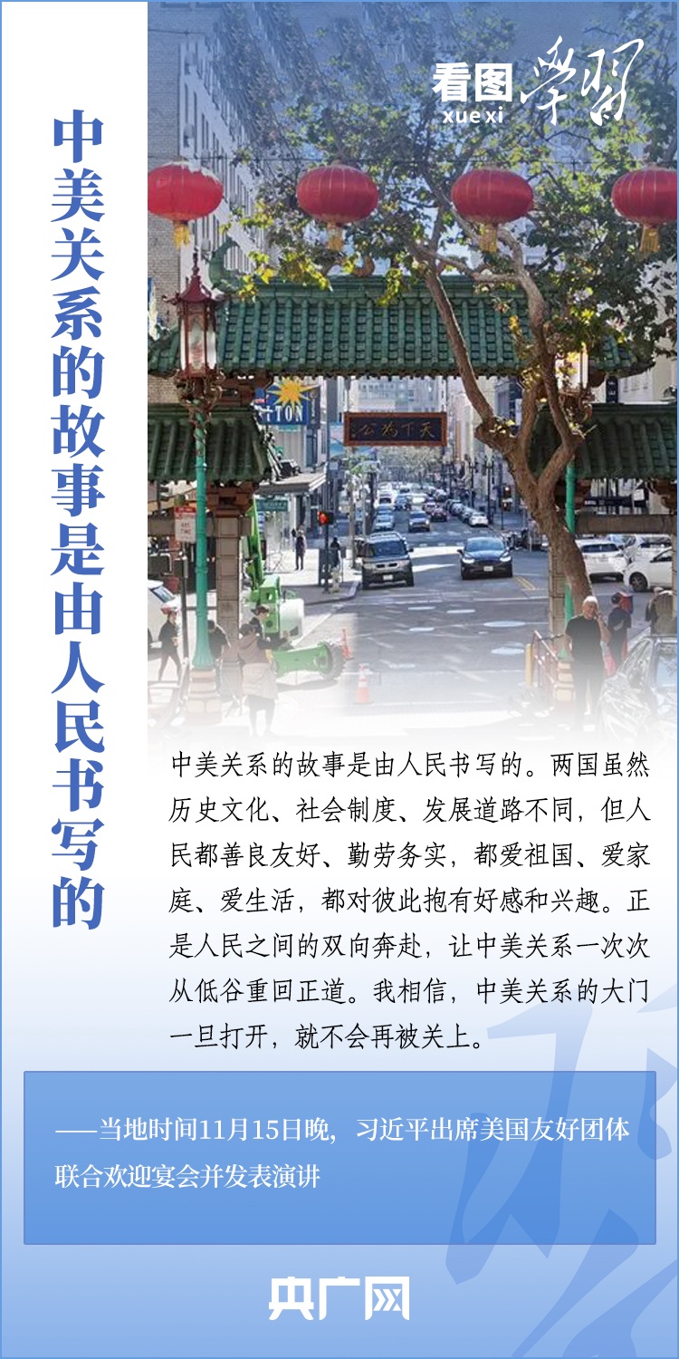 當(dāng)?shù)貢r間11月15日晚,國家主席習(xí)近平在美國舊金山出席美國友好團體聯(lián)合舉行的歡迎宴會并發(fā)表重要演講。習(xí)近平主席在演講中系統(tǒng)闡述了關(guān)于中美關(guān)系的一系列觀點、立場、原則,強調(diào)“中美關(guān)系希望在人民,基礎(chǔ)在民間,未來在青年,活力在地方”,希望匯聚起兩國人民的力量,賡續(xù)中美友誼,推進中美關(guān)系,努力為促進世界和平和發(fā)展作出更大貢獻!一起來學(xué)習(xí)。