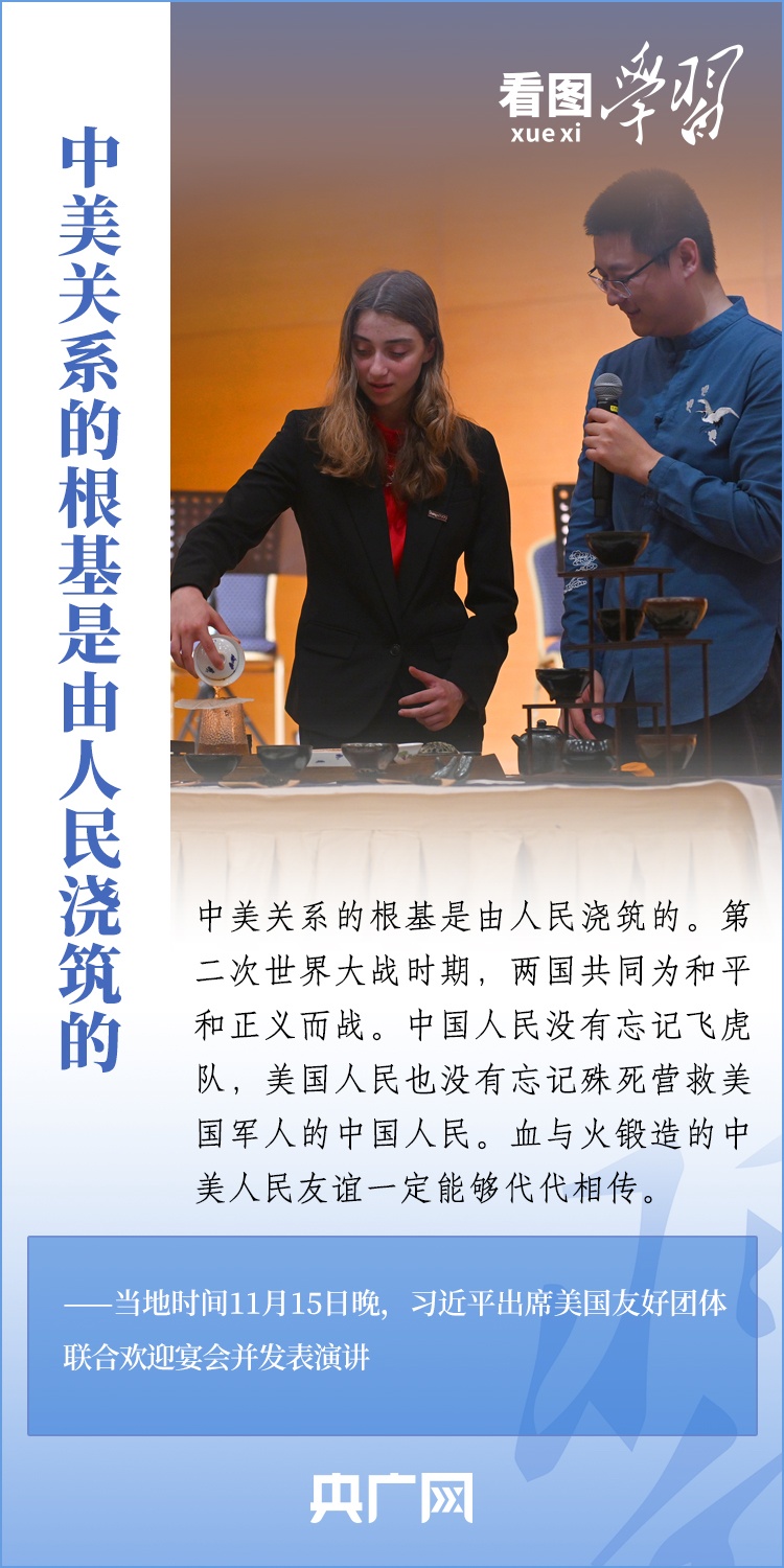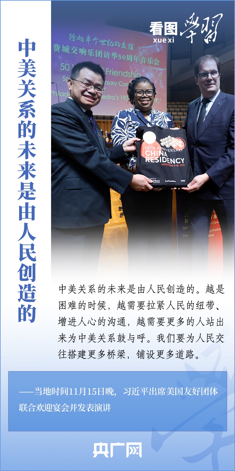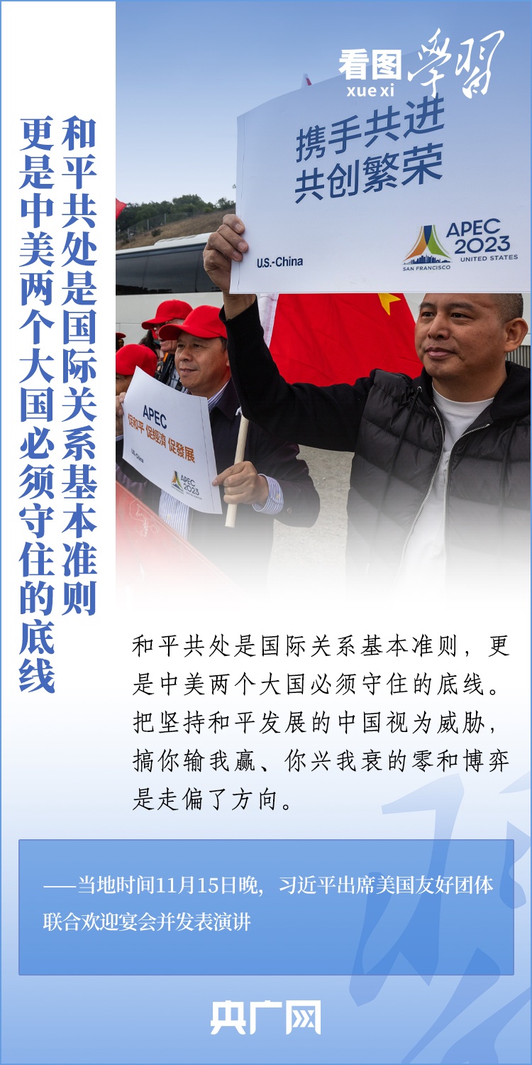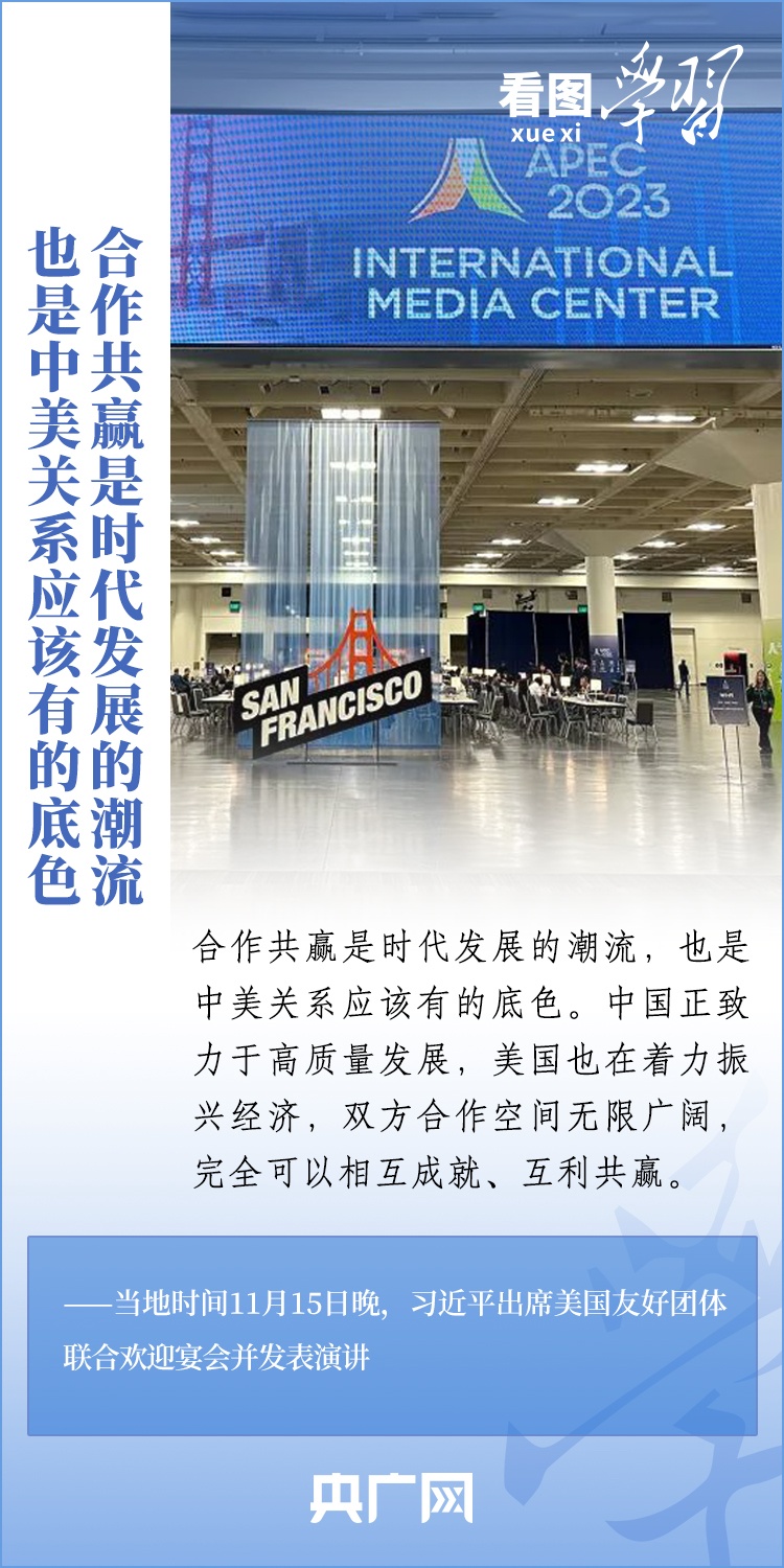 當(dāng)?shù)貢r間11月15日晚,國家主席習(xí)近平在美國舊金山出席美國友好團體聯(lián)合舉行的歡迎宴會并發(fā)表重要演講。習(xí)近平主席在演講中系統(tǒng)闡述了關(guān)于中美關(guān)系的一系列觀點、立場、原則,強調(diào)“中美關(guān)系希望在人民,基礎(chǔ)在民間,未來在青年,活力在地方”,希望匯聚起兩國人民的力量,賡續(xù)中美友誼,推進中美關(guān)系,努力為促進世界和平和發(fā)展作出更大貢獻!一起來學(xué)習(xí)。