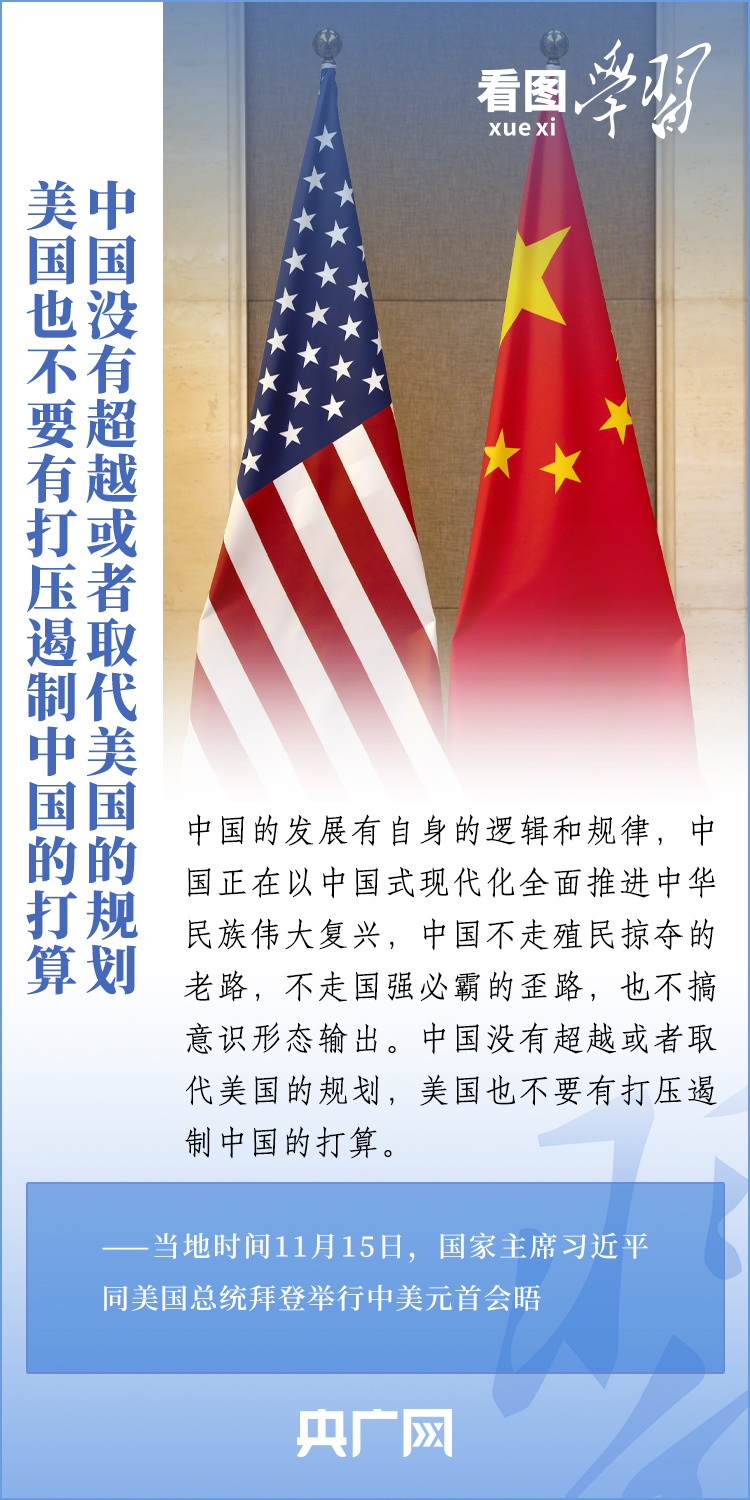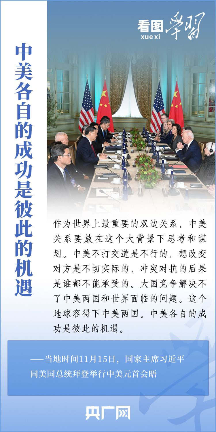 當?shù)貢r間11月15日,國家主席習近平在美國舊金山斐洛里莊園同美國總統(tǒng)拜登舉行中美元首會晤。兩國元首就事關中美關系的戰(zhàn)略性、全局性、方向性問題以及事關世界和平和發(fā)展的重大問題坦誠深入地交換了意見。習近平主席指出,大國競爭解決不了中美兩國和世界面臨的問題。這個地球容得下中美兩國。中美各自的成功是彼此的機遇。一起來學習!