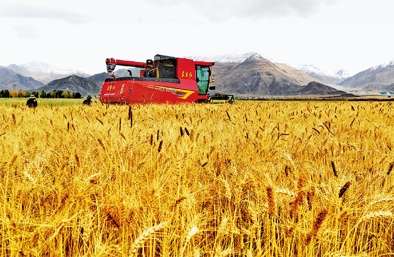 近年來,西藏自治區(qū)積極實施耕地改造,通過開展高標(biāo)準(zhǔn)農(nóng)田建設(shè),全方位提升耕地質(zhì)量與糧食產(chǎn)量,夯實糧食安全基礎(chǔ)。圖為工作人員駕駛農(nóng)業(yè)機械在拉薩市林周縣曲果強村的高標(biāo)準(zhǔn)農(nóng)田里收獲小麥(2023年10月12日攝)。 新華社記者 張汝鋒/攝