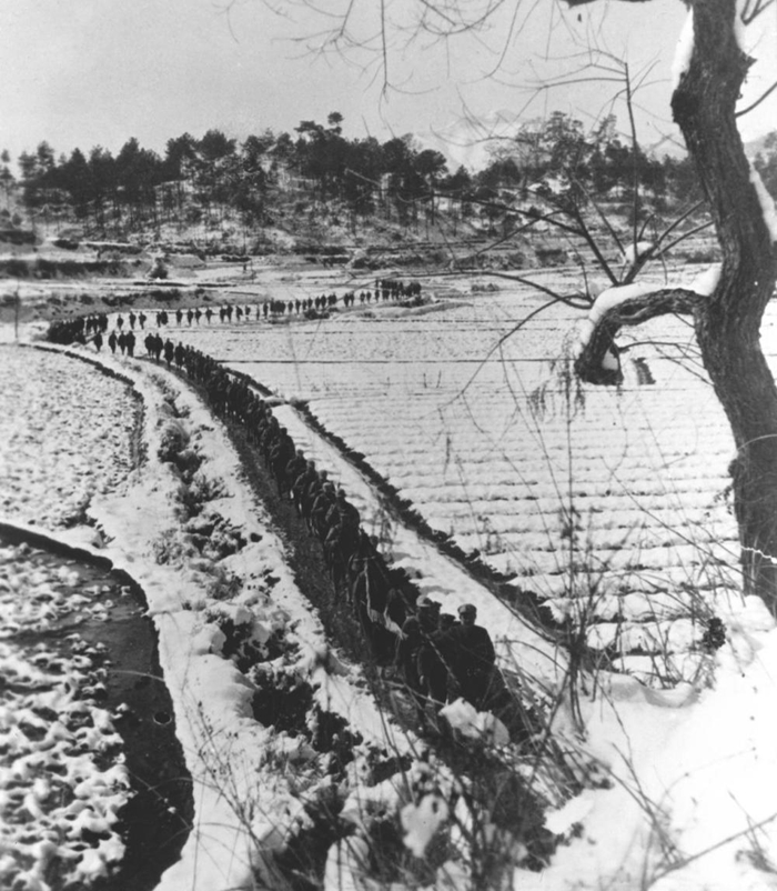 ↑ 抗日戰(zhàn)爭期間,新四軍在蘇北冰天雪地中行進(jìn)。
