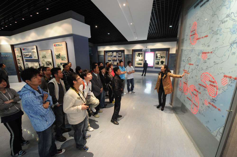 ↑ 在鹽城新四軍紀(jì)念館內(nèi),講解員在向觀眾介紹南方紅軍游擊隊整編為新四軍示意圖(2011年5月26日攝)。