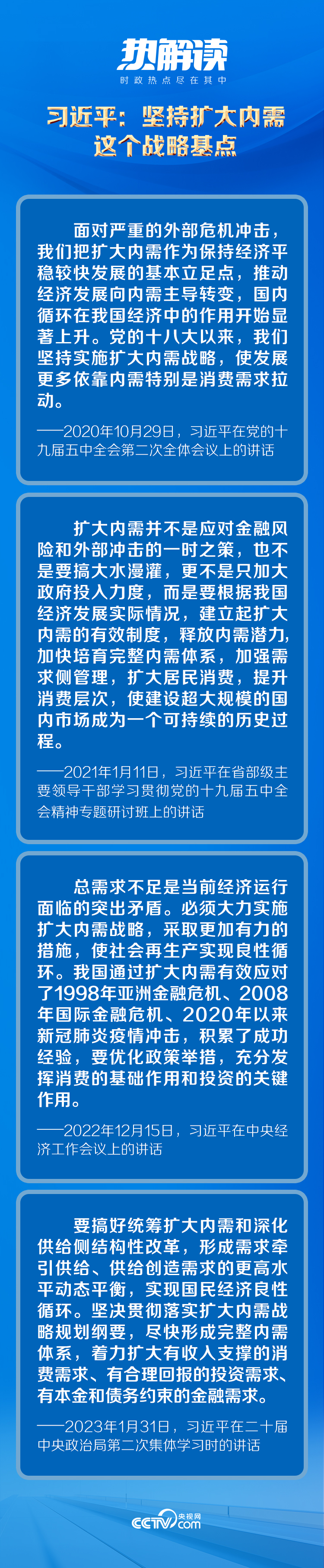 黨的十八大以來,習(xí)近平總書記從我國經(jīng)濟(jì)運(yùn)行的實際出發(fā),對擴(kuò)大內(nèi)需作出了一系列重要論述,為實施擴(kuò)大內(nèi)需戰(zhàn)略提供了科學(xué)指引。