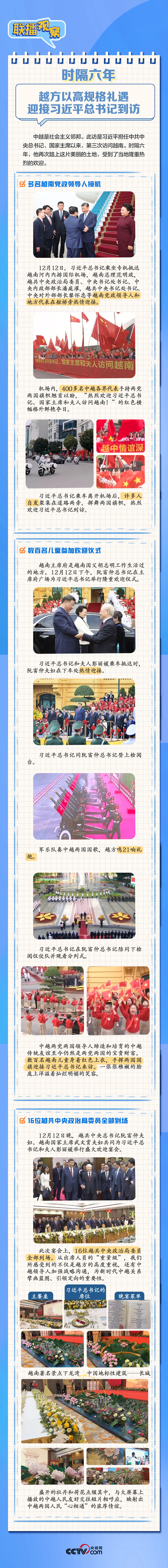 多名越南黨政領導人接機、中越各界代表手持兩黨兩國旗幟夾道歡迎、16位越共中央政治局委員全部到場參加歡迎宴會……訪越期間,習近平總書記受到越方高規(guī)格熱情接待,點滴細節(jié)見證兩國“同志加兄弟”情誼。