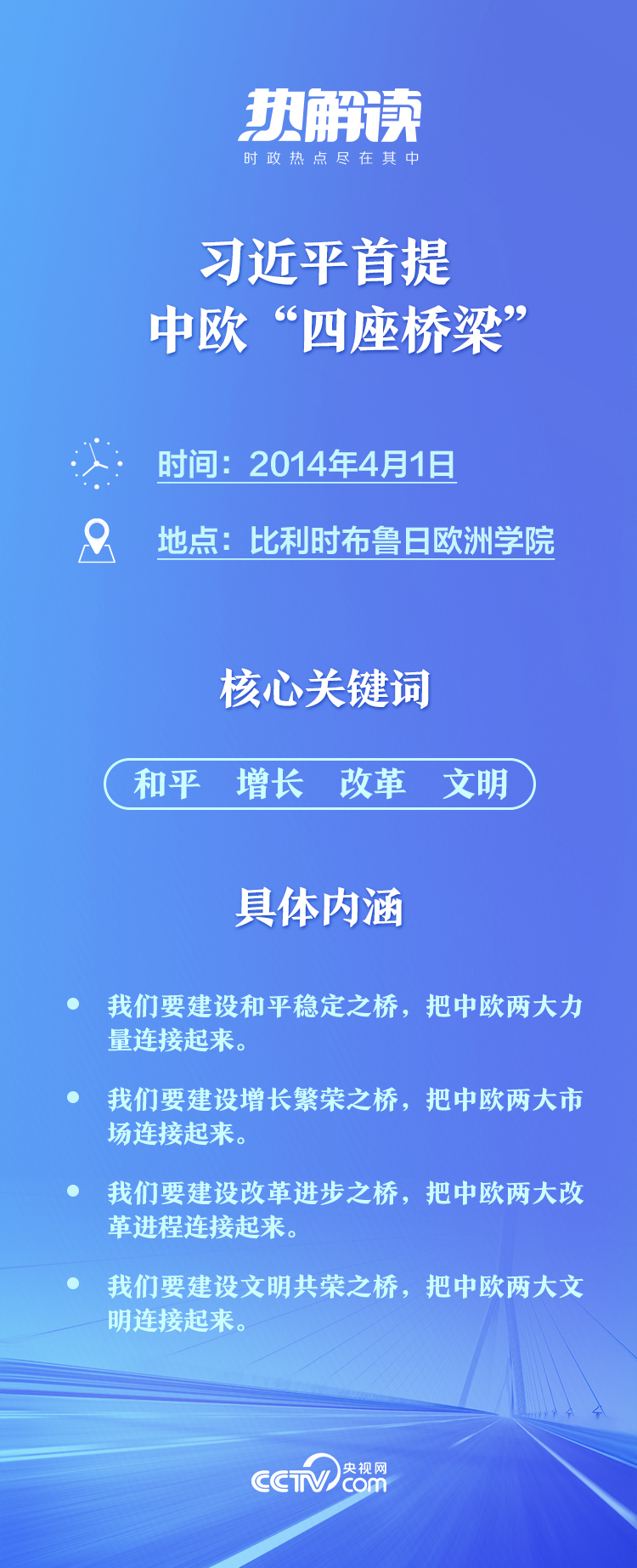 2014年,在位于比利時(shí)有著“歐洲政治家的搖籃”之稱的布魯日歐洲學(xué)院,習(xí)主席發(fā)表重要演講。他借用“布魯日”在弗拉芒語中“橋”的含義,全面闡述中國(guó)對(duì)歐政策,首次提出中歐要建設(shè)“四座橋梁”主張:
