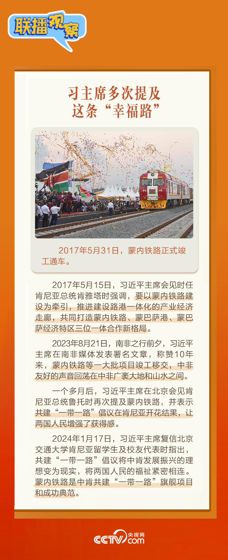 此前,習(xí)主席在外事活動中多次提及蒙內(nèi)鐵路,《新聞聯(lián)播》也持續(xù)關(guān)注這條路的建設(shè)及開通后的運營情況。這條“幸福路”有何特別之處,習(xí)主席為何頻頻提及?它的建成通車給當(dāng)?shù)貛砟男┳兓??《?lián)播觀察》邀您一同了解。