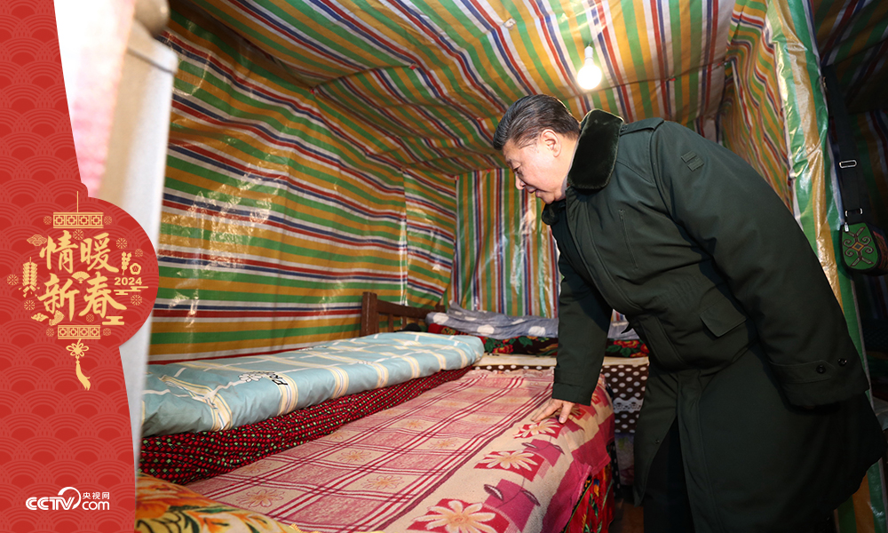 在貧困戶吉好也求家的土坯房里,總書記彎下腰,關(guān)切地掀開床褥、摸摸被子,看看夠不夠厚實。