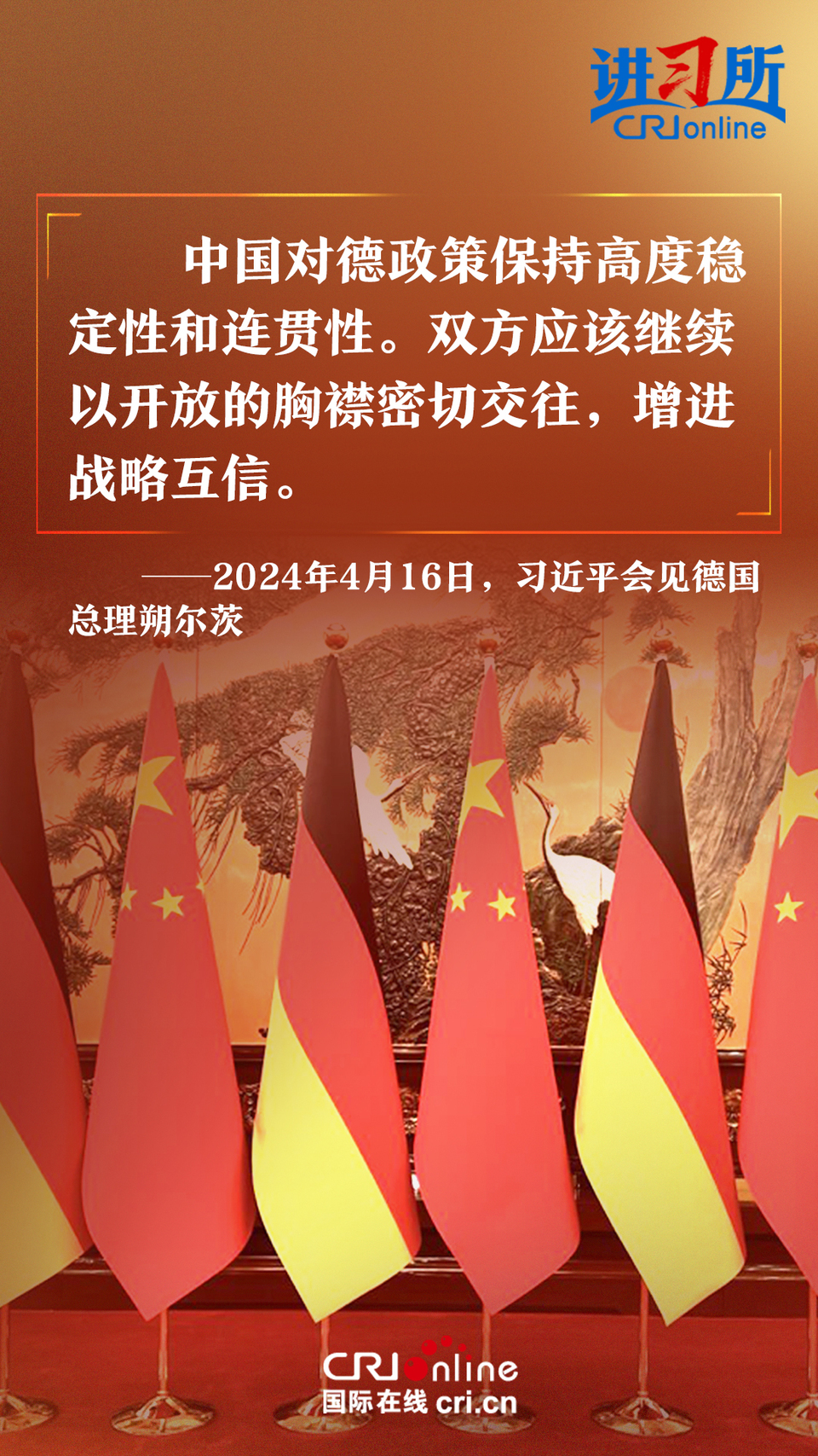 4月16日上午,中國國家主席習(xí)近平在北京釣魚臺(tái)國賓館會(huì)見了德國總理朔爾茨。習(xí)近平指出,中德合作對雙方有利,對世界有利。世界越是動(dòng)蕩,雙方越要提升兩國關(guān)系的韌性和活力。中德是世界第二、第三大經(jīng)濟(jì)體,鞏固和發(fā)展中德關(guān)系的意義超越雙邊關(guān)系范疇,對亞歐大陸乃至整個(gè)世界都有重要影響。兩國要從長遠(yuǎn)和戰(zhàn)略角度看待和發(fā)展雙邊關(guān)系,攜手為世界注入更多穩(wěn)定性和確定性。