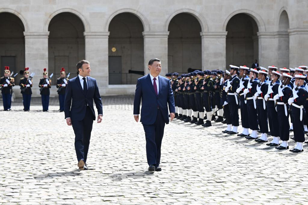 ??當(dāng)天下午,習(xí)近平在巴黎出席馬克龍舉行的隆重盛大歡迎儀式。兩國元首檢閱法蘭西共和國衛(wèi)隊和陸??杖妰x仗隊,并觀看分列式。