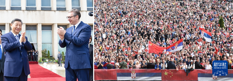 ??當(dāng)?shù)貢r(shí)間5月8日上午,國家主席習(xí)近平在貝爾格萊德塞爾維亞大廈同塞爾維亞總統(tǒng)武契奇舉行會(huì)談。會(huì)談前,武契奇陪同習(xí)近平來到政府大廈平臺(tái)(左圖)。大廈廣場(chǎng)上,一萬五千名塞爾維亞民眾揮舞中塞兩國國旗,對(duì)習(xí)近平表示最熱烈的歡迎(右圖)。(拼版照片) 新華社記者 黃敬文 丁海濤 攝
