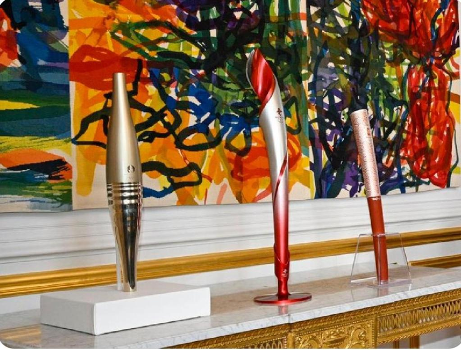 ??在法國愛麗舍宮一層肖像廳,三支奧運(yùn)火炬并排而立,格外引人注目。這是中法兩國元首夫婦互贈(zèng)禮品之一。