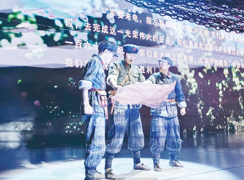 “同志們,跟我前進!”“以最快速度趕到瀘定橋,才是我們的首要任務……”舞臺大幕開啟,影像結合舞美形成一組巨型浮雕,在燈光的映照下,紅軍戰(zhàn)士堅毅的臉龐漸漸浮現(xiàn),他們佇立在瀘定橋旁,目光如炬。燈滅,炮火聲從遠處傳來……這是大型原創(chuàng)舞臺劇《飛奪瀘定橋》中的場景,每天上午10時30分和下午3時,該劇在瀘定縣紅軍飛奪瀘定橋紀念碑公園內(nèi)的紅軍劇場上演。偉大的長征是中國共產(chǎn)黨和紅軍譜寫的壯麗史詩,是中華民族偉大復興歷史進程中的巍峨豐碑。舞臺劇《飛奪瀘定橋》聚焦宏大歷史中的典型事件,以紅軍長征途中飛奪瀘定橋戰(zhàn)役為背景,以一個紅軍小號手的視角,生動講述紅四團晝夜奔襲240里,22名突擊隊員在槍林彈雨中踩著13根鐵索成功奪下瀘定橋的故事,藝術展現(xiàn)紅軍的堅定革命信念和必勝信心,讓觀眾在感動中重溫偉大長征精神。