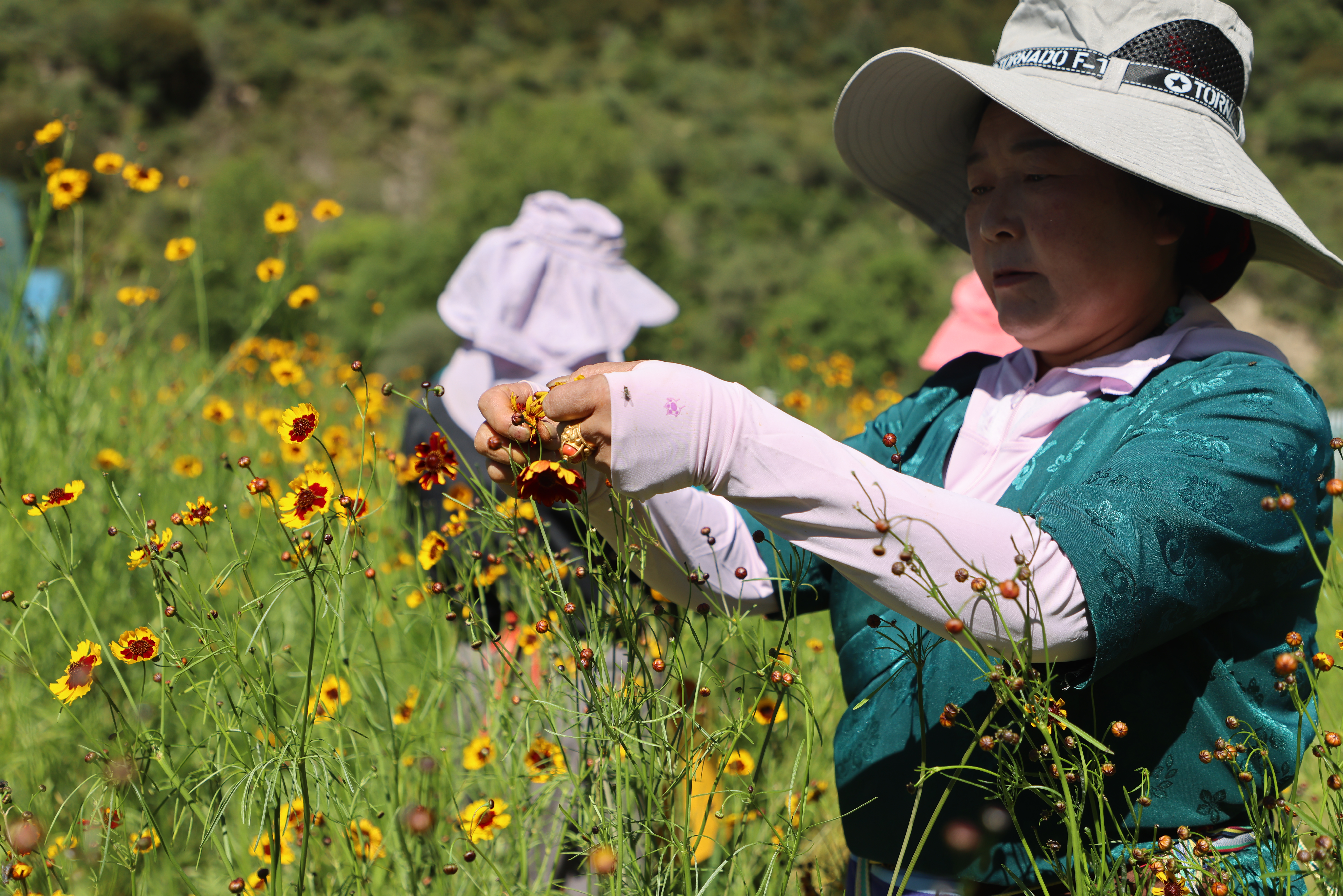 甘孜日報社 初秋時節(jié),康巴大地逐步換上金色的“秋裝”。走進(jìn)白玉縣農(nóng)研科普中心,成片的藏菊傲然怒放,層層疊疊的花海,猶如金紅色的波浪,在秋風(fēng)中翻滾,與藍(lán)天白云、青山綠水相互映襯,美不勝收。忙著采摘花朵的當(dāng)?shù)厝罕姶┧笤诨êV?,談笑間手法嫻熟地將花朵采摘、裝袋……這被譽(yù)為“軟黃金”的藏菊,不僅為鄉(xiāng)村增添了美景,也成為了助力當(dāng)?shù)厝罕娫鍪盏囊淮筇厣a(chǎn)業(yè)。