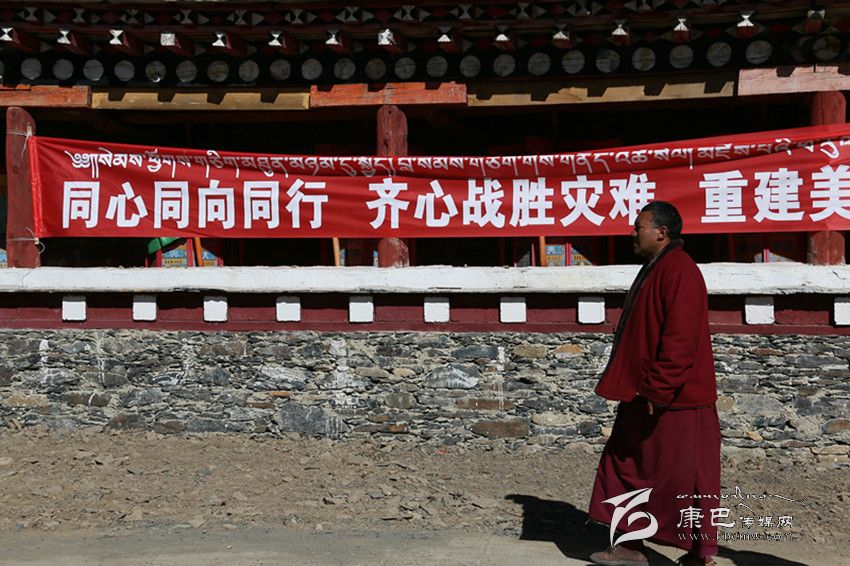 記者注意到,在金龍寺大門處的圍墻上貼著一面寫有“同心同向,共渡難關(guān),重建家園”的紅色橫幅,一位僧人口中念念有詞,走過橫幅,向新搭建的救災帳篷走去,另一位僧人則拿著一柄鋤頭走出寺院大門,隨同另一批救災人員去處理前幾日垮塌在地的石頭。